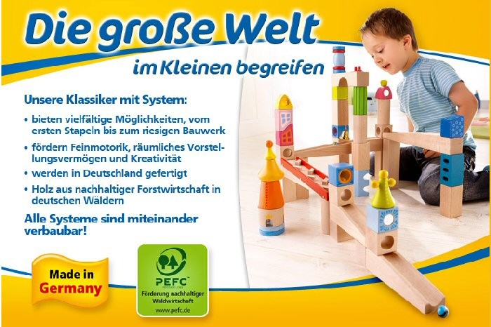 Haba Kugelbahnen in verschiedenen Schwiegrigkeitsstufen zum Erlernen handwerklicher Fähigkeiten, reichhaltiges Angebot an Puppen und Puppenzubehör, Accessoires für das Kinderzimmer.