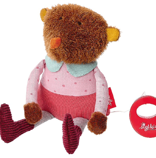 Träum' süß, mein Schatz! Die Kindergarten-Freunde Spieluhren von sigikid spielen kein gewöhnliches Einschlaflied, sondern bekannte Kinderlieder. Diese hübsche Version in Form eines Bärens spielt "Alle meine Entchen". Einen besonderen Touch erhält das niedliche Bären-Mädchen durch die Kombination aus weichen Materialien und die Füllung aus Polyesterwatte. Das Spielwerk kann mittels des Sicherheitsreißverschlusses herausgenommen werden und die Spieluhr sodann problemlos in der Maschine gewaschen werden. Das Obermaterial besteht zu 90% aus Baumwolle und 10% Polyester.